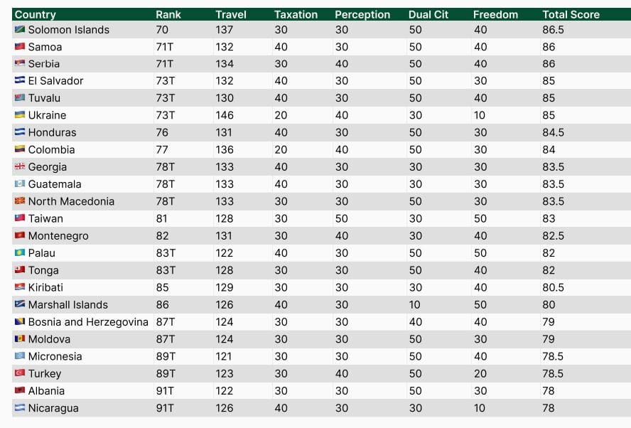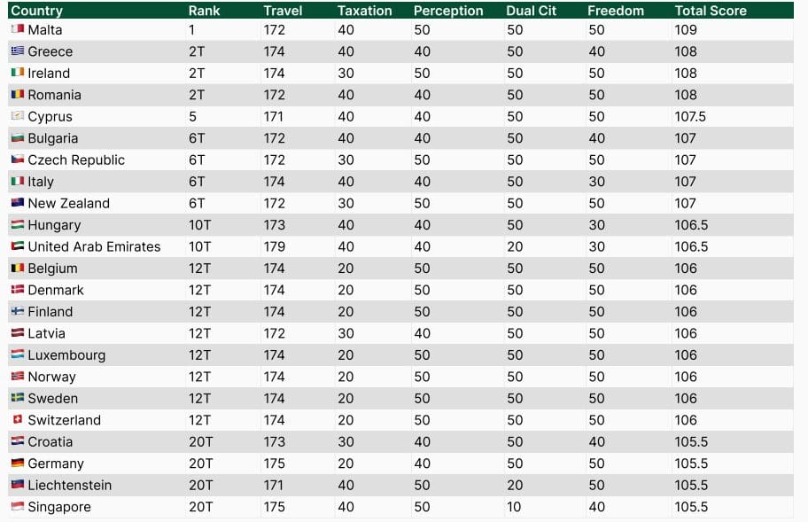 Эксперты оценивали 199 стран по пяти критериям: возможность безвизовых поездок, налоговую систему, международную репутацию, условия для двойного гражданства и уровень личных свобод. Первое место заняла Мальта, второе разделили Румыния, Греция и Ирландия, за ними следует Кипр.