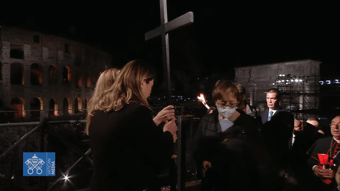 В Страстную пятницу, 15 апреля, в Риме состоялось традиционное крестное шествие. Уроженки Украины и России Ирина и Альбина совместно пронесли прецессионный крест во время традиционного Крестного пути («Via Crucis») в присутствии папы римского Франциска у Колизея в итальянской столице, сообщает DW.
