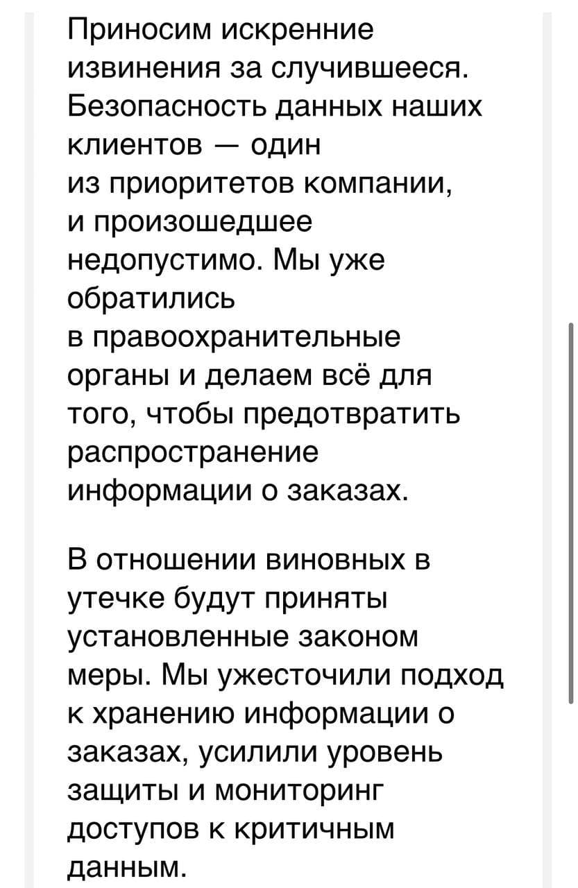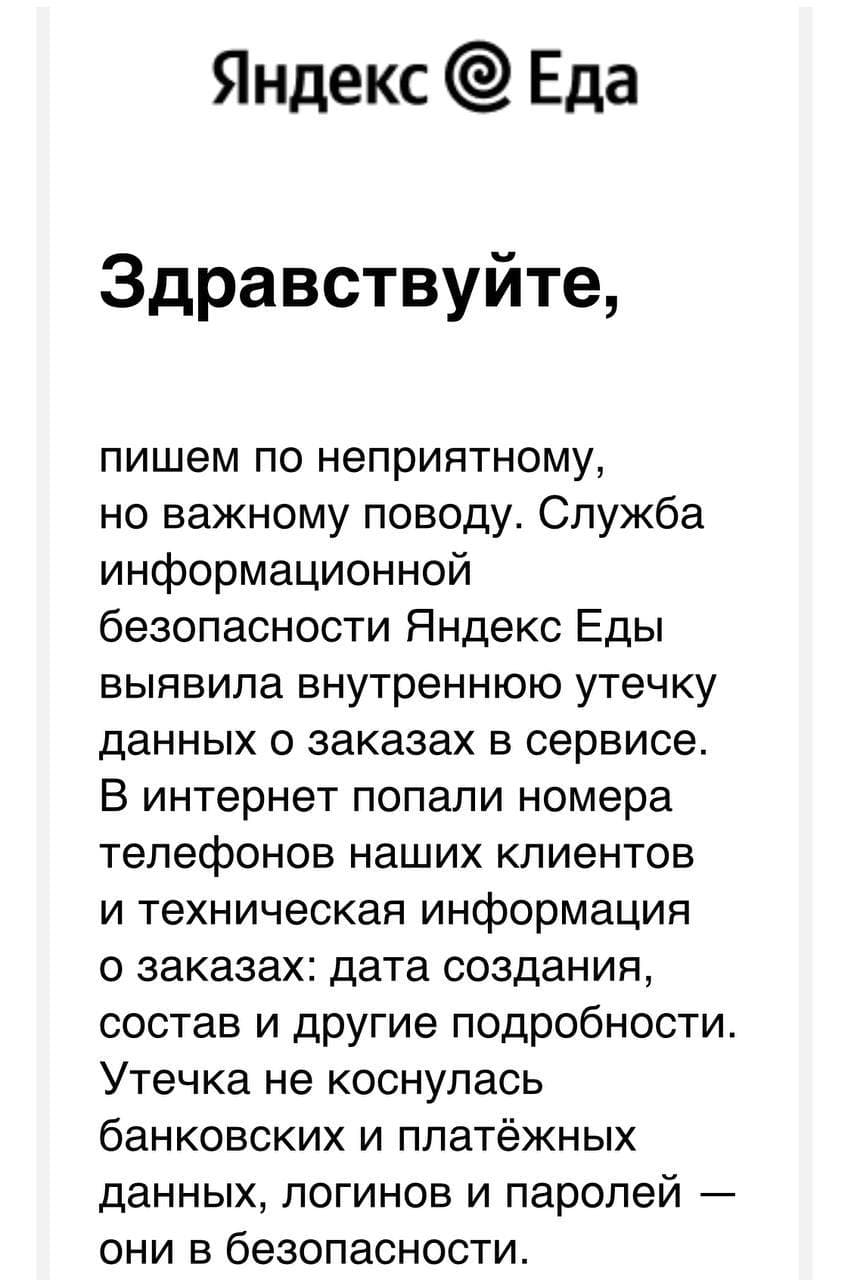 «Служба информационной безопасности «Яндекс.Еда» выявила внутреннюю утечку данных о заказах в сервисе. В интернет попади номера телефонов наших клиентов и техническая информация о заказах. Утечка не коснулась банковских и платежных данных. В отношении виновных в утечке будут приняты установленные законом меры»- говорится в сообщении компании.