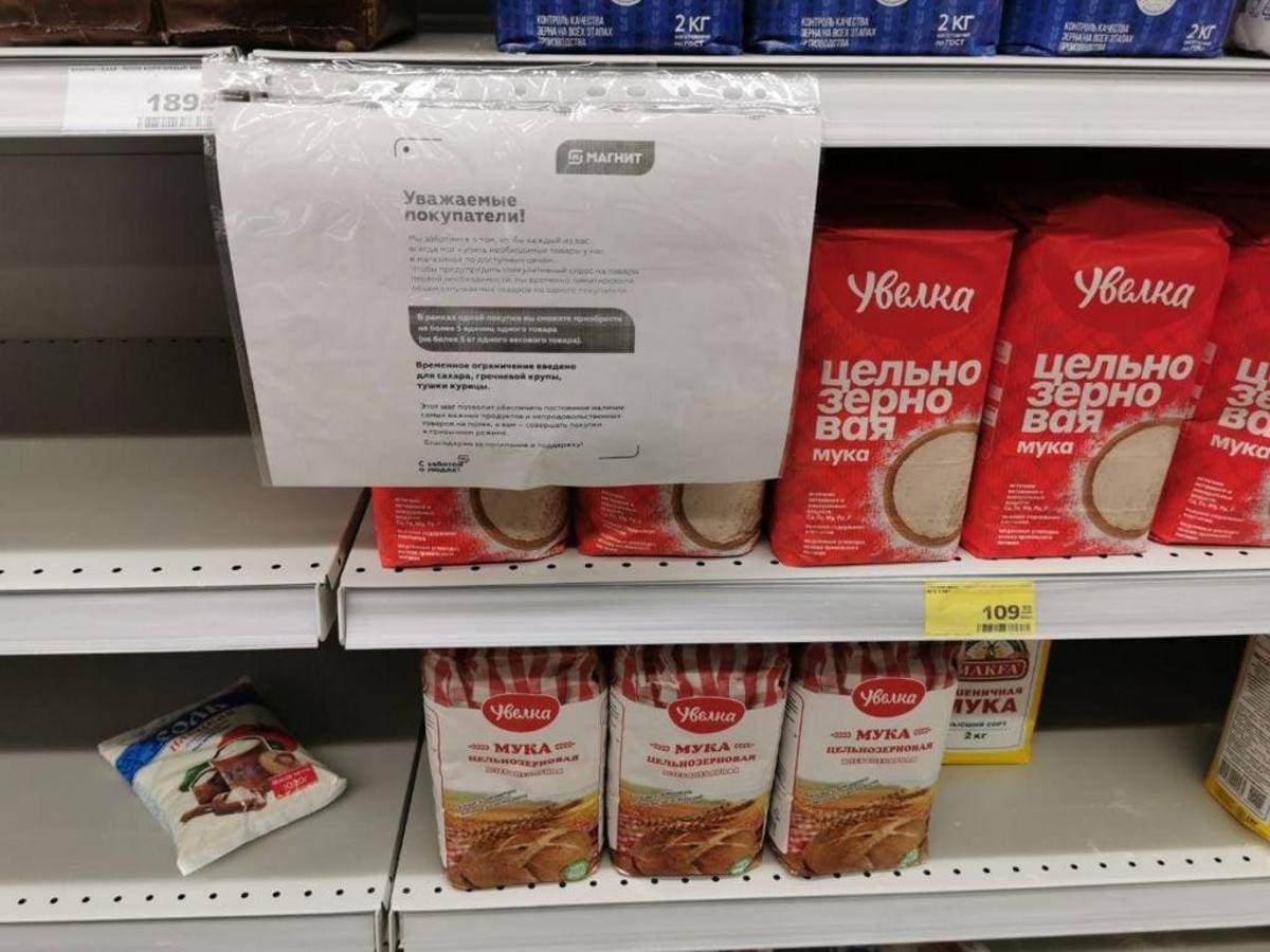 Крупные продуктовые магазины в России ввели ограничения на продажу ряда продуктов в одни руки, передает ВВС.