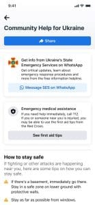 Это включает в себя информацию о том, где искать медицинскую помощь, как оставаться в безопасности и как получить помощь – как в Украине, так и после пересечения гражданами границ соседних стран. Ресурс также предоставляет доступ к информационной горячей линии Государственной службы по чрезвычайным ситуациям Украины в WhatsApp, которая помогает людям получать важную информацию, включая процедуры реагирования на чрезвычайные ситуации. Ссылка на Помощь сообщества будет размещена в верхней части лент украинцев в Facebook и Instagram, а также в верхней части результатов соответствующих поисков на Facebook. Он станет доступным в Украине, Польше, Румынии, Словакии, Венгрии и Молдове и показан на украинском, русском или английском языках.