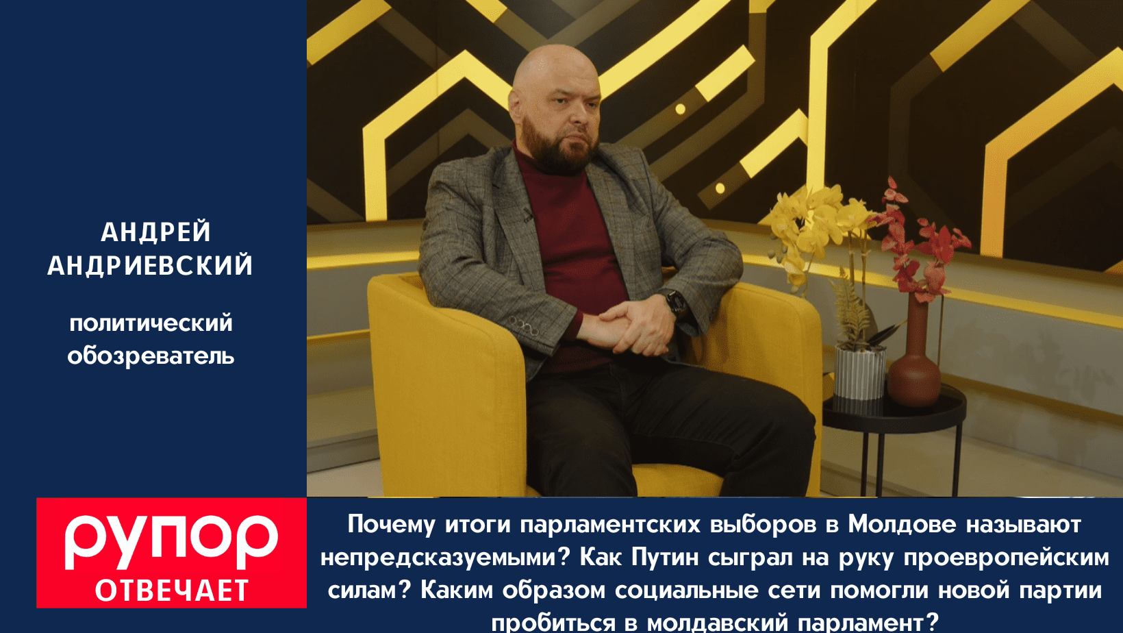 Андрей Андриевский, политический обозреватель, в интервью rupor.md делится своим взглядом на «неожиданные результаты» парламентских выборов. Он объясняет, как блогер Костюк сумел преодолеть порог и попасть в парламент, почему агрессивная кампания пророссийских сил сплотила проевропейцев и что обязан сделать новый парламент «максимум до 2029 года».