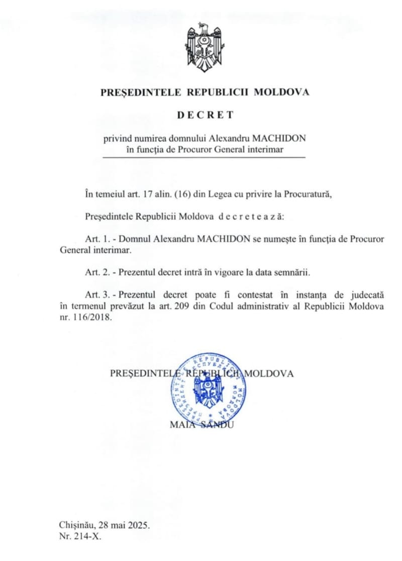 Президент Республики Молдова Майя Санду подписала указ о назначении Александра Макидона на должность и.о. Генерального прокурора. Его кандидатуру предложил Высший совет прокуроров по итогам заседания от 28 мая текущего года. Сегодня, 29 мая, глава государства представила его коллективу Генпрокуратуры.