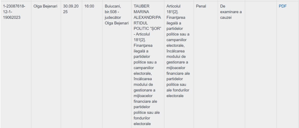 Суд сектора Буюканы в Кишинёве назначил заседание по делу Марины Таубер на вторник, 30 сентября, на 16:00. Таубер обвиняется в получении финансирования партии от преступной группы «Шор», фальсификации финансовых отчётов и вмешательстве в судебные процессы.
