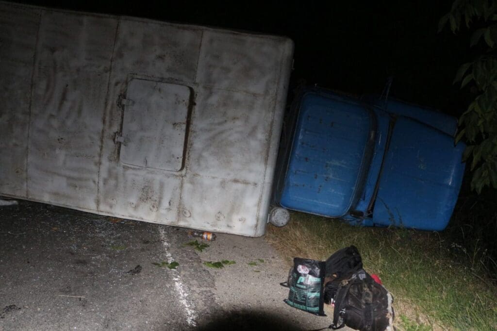 В результате удара грузовик перевернулся, а легковой автомобиль оказался в канаве на обочине дороги.