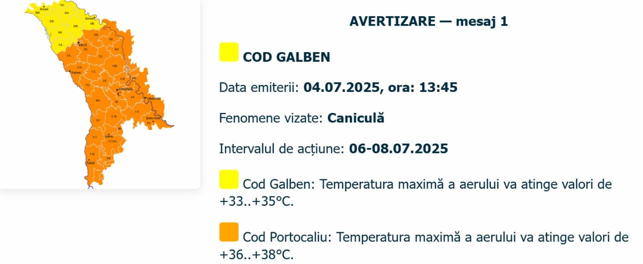 Государственная гидрометеорологическая служба Молдовы выпустила метеопредупреждение в связи с аномальной жарой. В период с 6 по 8 июля на территории всей страны ожидаются экстремально высокие температуры воздуха.