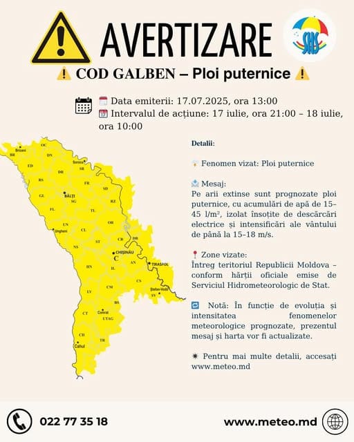 Государственная гидрометеорологическая служба выпустила предупреждение о неблагоприятных погодных условиях. «Желтый код» введен в связи с ливнями, которые могут накрыть Молдову в ближайшие сутки.