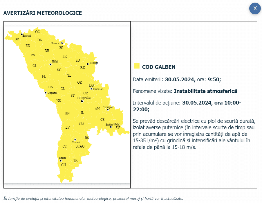 В Молдове снова объявили новый «желтый код». По данным Государственной гидромеослужбы, предупреждение действует до 22:00.