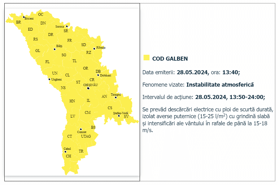 На всей территории Молдовы 28 мая объявлен желтый код. Предупреждение действует с 13:50 до 00:00.