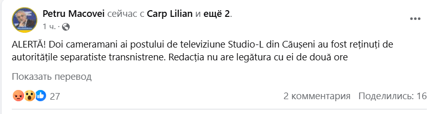 «Спецслужбы» Тирасполя задержали двух молдавских операторов и незаконно продержали несколько часов. Об этом сообщил директор Ассоциации независимой прессы Петру Маковей.