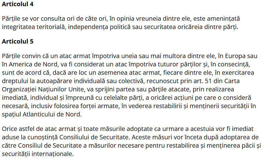 Статья 4 Договора НАТО предусматривает, что любое государство-член может запросить консультации, если оно считает, что его независимость, территориальная целостность или безопасность находятся под угрозой. Статья 5 закрепляет принцип, согласно которому вооружённое нападение на одного члена альянса считается нападением на всех. Она была применена лишь однажды в истории — после террористических атак 11 сентября 2001 года в США.