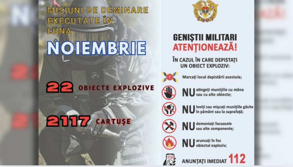 В прошлом месяце в селе Шерпены Новоаненского района саперы обезвредили бомбу и 14 ручных гранат времен Второй мировой войны. Всего в ноябре саперы обнаружили и уничтожили 22 взрывоопасных предмета, а также 2117 патронов в Дубоссарском, Унгенском, Штефан-Водском районах. По словам старшего офицера Саперной службы Ивана Корнегруцы, операция в Шерпенах была одной из самых опасных. «В […]