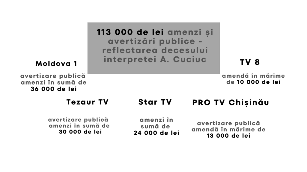 Совет по телевидению и радио (СТР) 19 декабря рассмотрел, как крупнейшие телевизионные каналы освещали смерть дочери музыкального исполнителя Игоря Кучука Андреи Кучук. Проверили телеканалы «Cinema 1», «Jurnal TV», «Exclusiv TV», «Star TV», «Moldova 1», «One TV», «TV8», «Pro TV Chișinău», «N4», а также тематический канал «Tezaur TV». Проверка была направлена на соблюдение положений в отношении […]