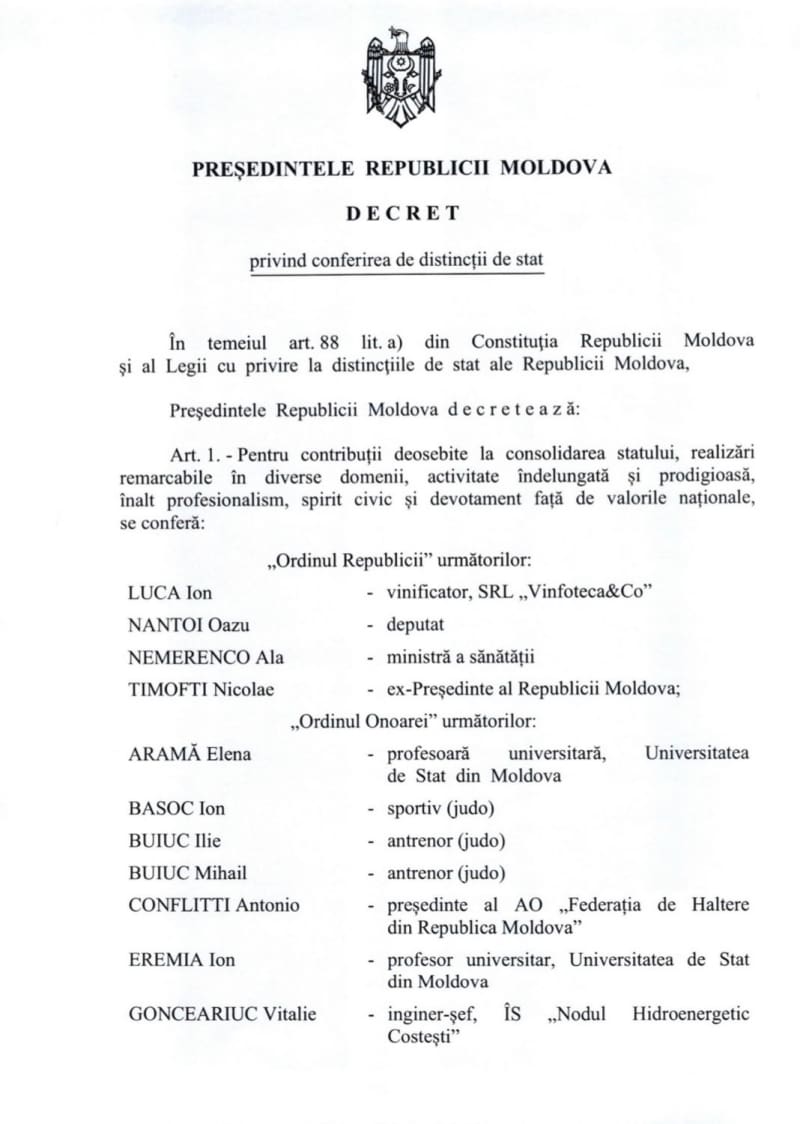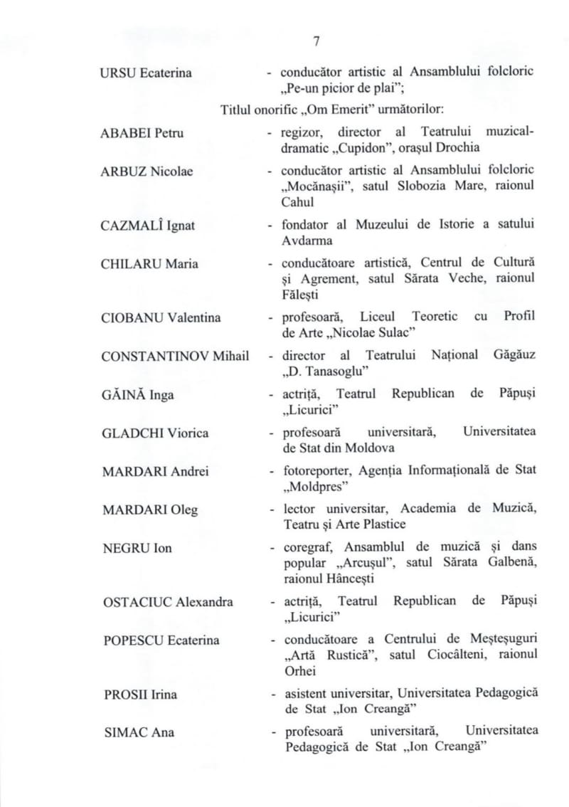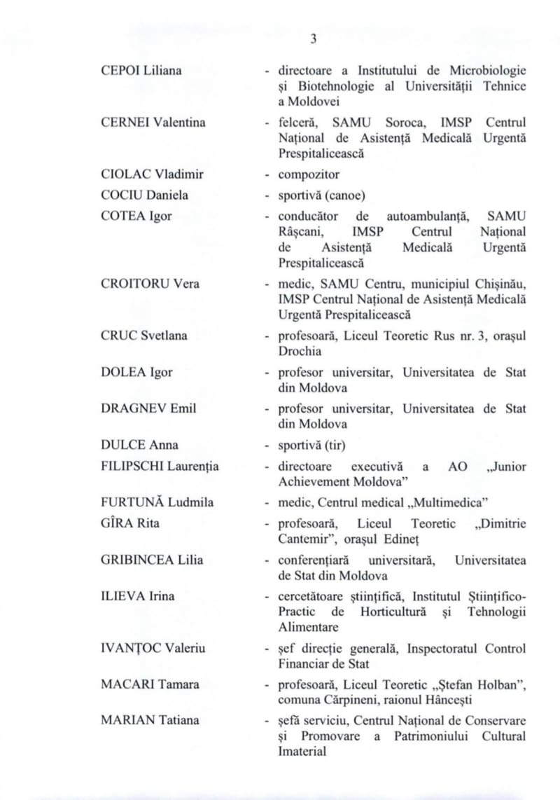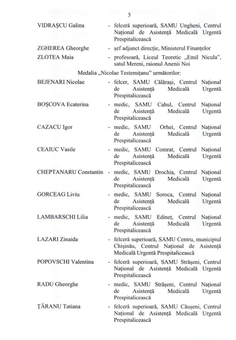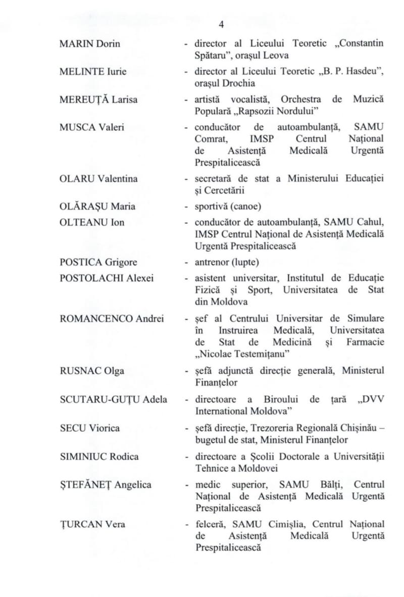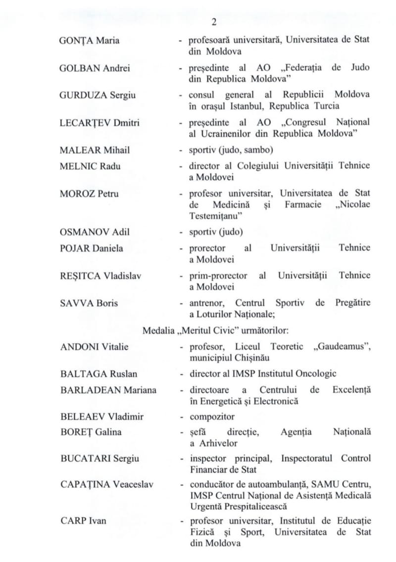 Медаль «За заслуги» (Meritul Civic) получили: Даниела Кочу, Анна Дулче и Мария Олэрашу. Медаль получил и 41 человек из различных сфер деятельности.