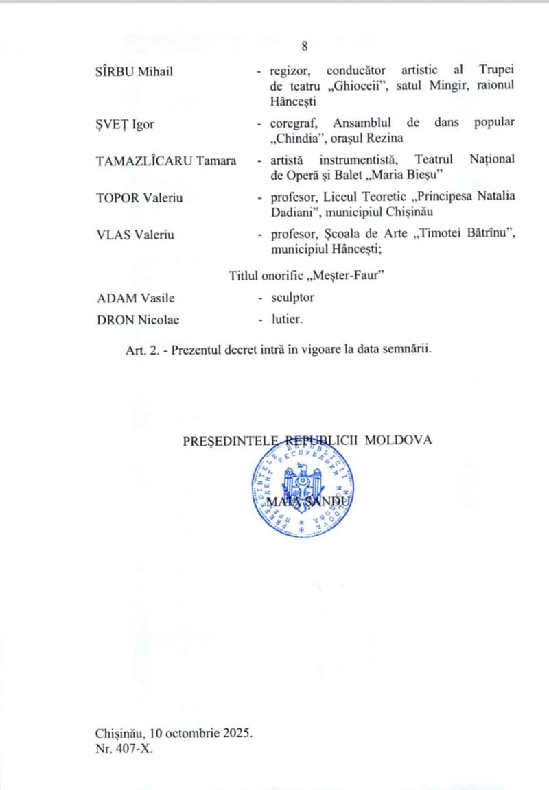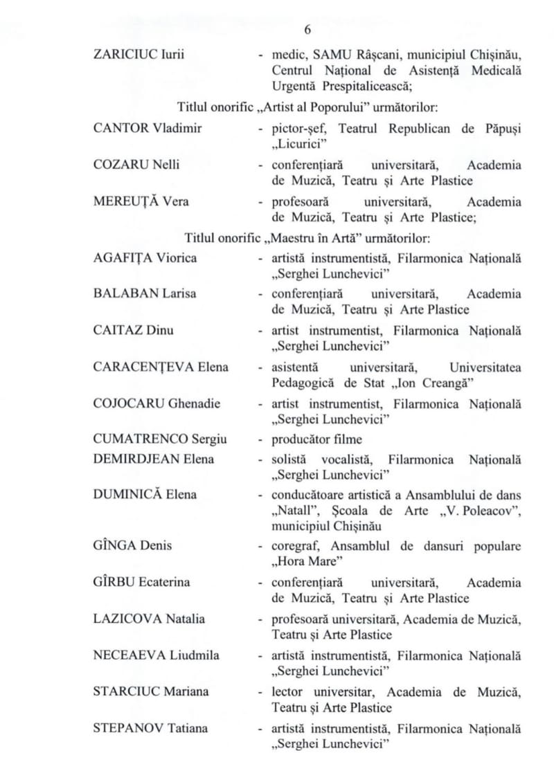 Майя Санду вручила медаль имени Николая Тестемицяну 12 представителям отрасли, почётное звание «Народный артист» – трём, включая Веру Мереуцэ – голос которой звучит в троллейбусах столицы, почётное звание «Мастер искусства» – 15 деятелям, а также почётное звание Om Emerit – 20 людям.
