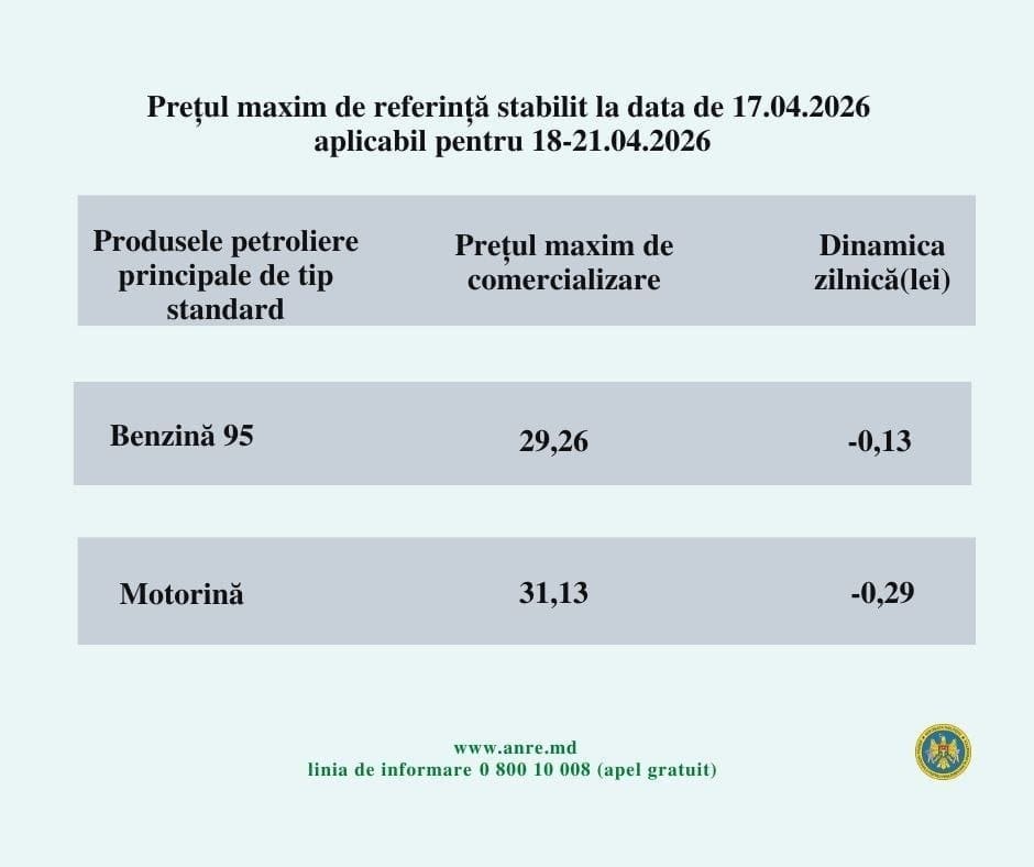 Цена бензина также продемонстрировала падение. Стоимость одного литра снизилась на 13 банов и составит 29,26 лея.