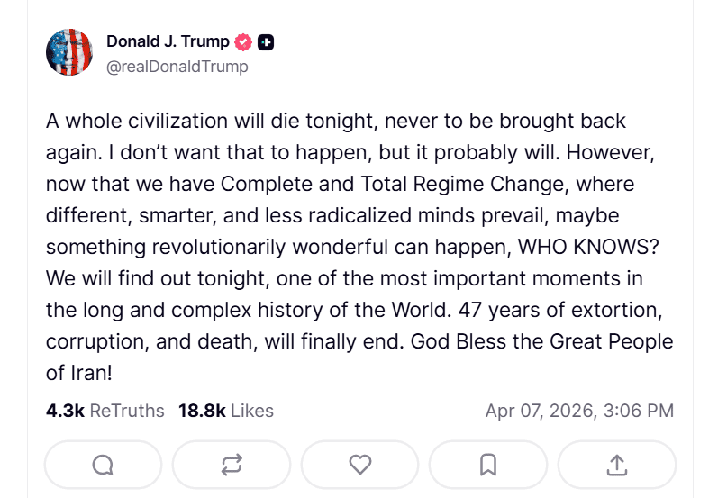 «Целая цивилизация погибнет сегодня ночью, и ее уже никогда не вернуть. Я не хочу, чтобы это произошло, но, вероятно, так и будет», — написал Трамп в соцсети Truth Social. Он подчеркнул, что США способны уничтожить Иран «за четыре часа» и уже подготовили соответствующий план действий. При этом президент добавил, что надеется на «нечто по-настоящему революционное» после возможной смены режима на «менее радикальные силы».
