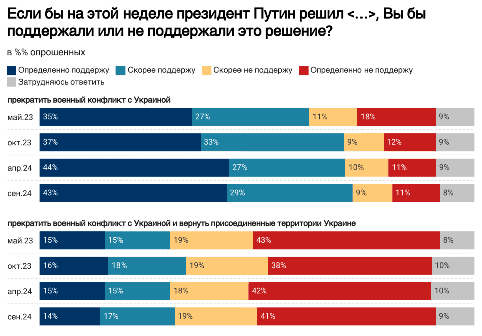 Согласно исследованию, 31% респондентов поддержат решение президента Владимира Путина, если тот прекратит войну на условиях Киева — то есть с полным выводом российских войск со всех захваченных земель. «Определенно» готовы поддержать такое развитие событий 14% россиян, еще 17% заявили, что «скорее» его поддержат.