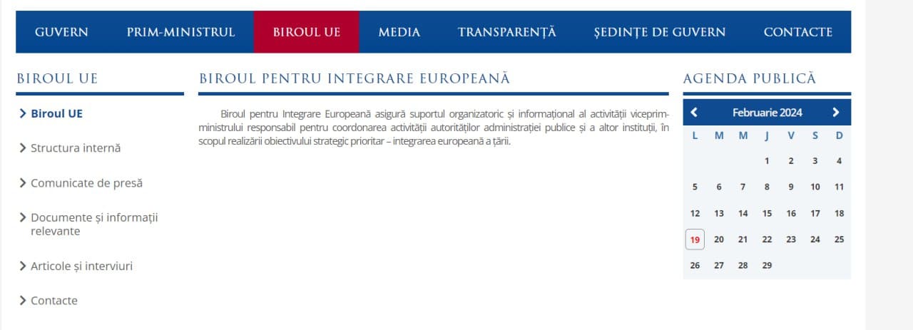 Уточняем, что на сайте исполнительной власти появился новый раздел — Офис ЕС. В нем представлены контакты, пресс-релизы о деятельности ответственных за европейскую интеграцию Молдовы и соответствующие документы, но пока страница, похоже, находится в стадии разработки.