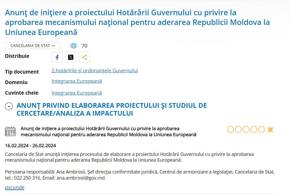 «Госканцелярия объявляет о начале процесса разработки Постановления правительства об утверждении национального механизма присоединения Республики Молдова к Европейскому Союзу», — говорится в сообщении, опубликованном ведомством.