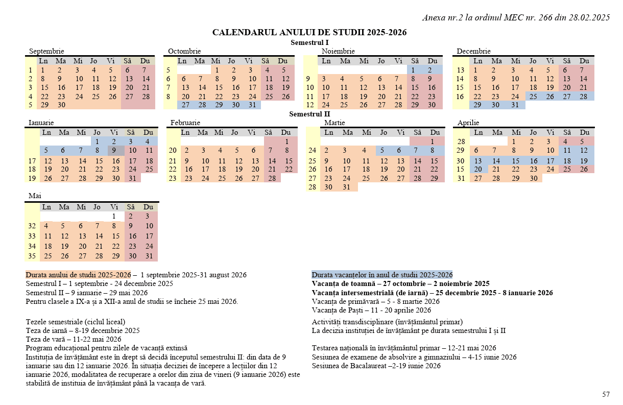 Продолжительность каникул установлена ​​в Календаре на 2025-2026 учебный год, утвержденном приказом Министерства образования и исследований.