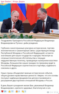 Бывший президент Молдовы, а ныне один из лидеров Патриотического блока, занявшего второе место на прошедших выборах, Игорь Додон утром 7 октября опубликовал поздравление российскому диктатору Владимиру Путину по случаю его 72-летия.