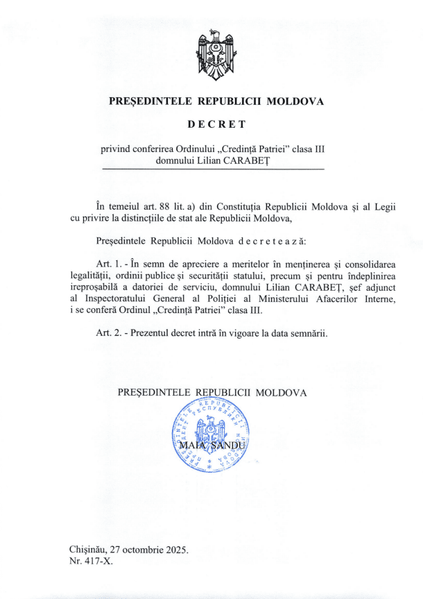 Вторым указом президент наградила заместителя главы ГИП Лилиана Карабеца государственной наградой. Ему был присвоен Орден «Верность Родине» III степени (Ordinul «Credință Patriei» clasa III). Награда вручена «в знак признания заслуг в поддержании и укреплении законности, общественного порядка и безопасности, а также за безупречное выполнение служебного долга».