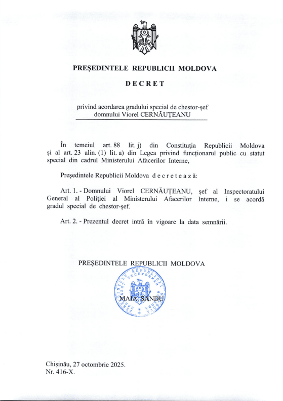 Президент Республики Молдова Майя Санду 27 октября 2025 года подписала два указа, касающихся руководства Генерального инспектората полиции (ГИП) министерства внутренних дел.