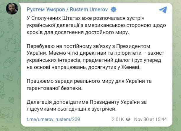 В воскресенье, 30 ноября, секретарь СНБО Украины Рустем Умеров сообщил, что во Флориде началась встреча украинской делегации с американской стороной для обсуждения шагов по «достижению достойного мира». Сообщение было опубликовано в Telegram и через несколько минут удалено.