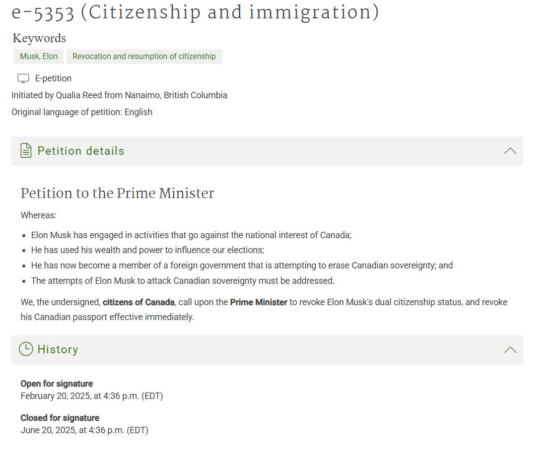 В петиции утверждается, что бизнесмен Маск «использует свое богатство и власть для влияния на канадские выборы» и «является членом иностранного правительства, которое стремится стереть суверенитет Канады».