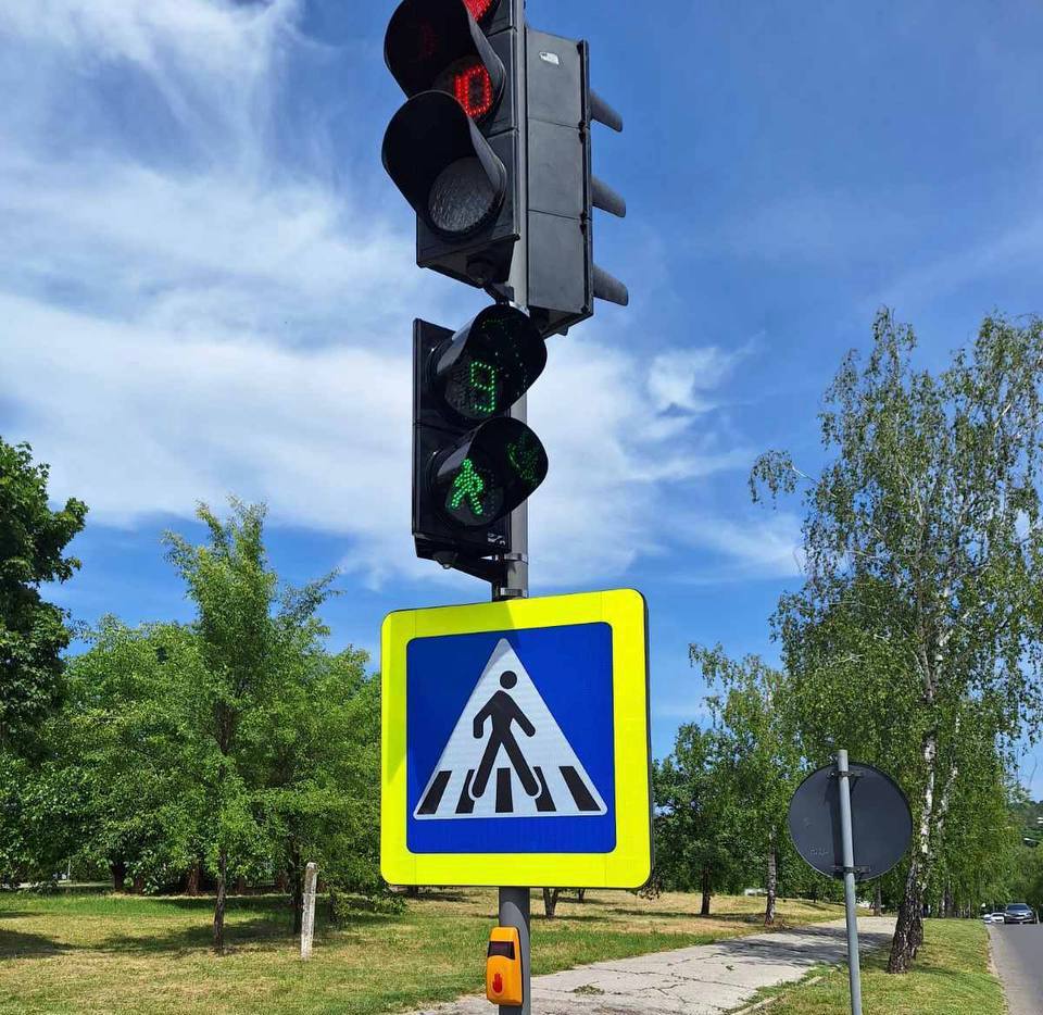 Новые светофоры оснащены светодиодными светильниками, таймерами, сенсорными кнопками вызова и звуковым сигналом при включении, а также была заменена одна из опорных стоек.