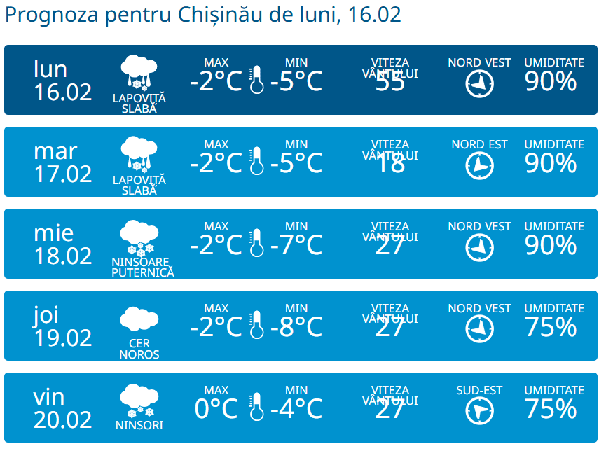 После незначительного потепления в Молдове снова ожидается снег и понижение температуры. На вторник, 17 февраля Государственная гидрометеорологическая служба прогнозирует мокрый снег, а в среду в большинстве регионов страны выпадет снег.
