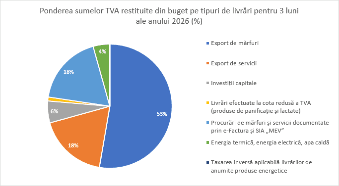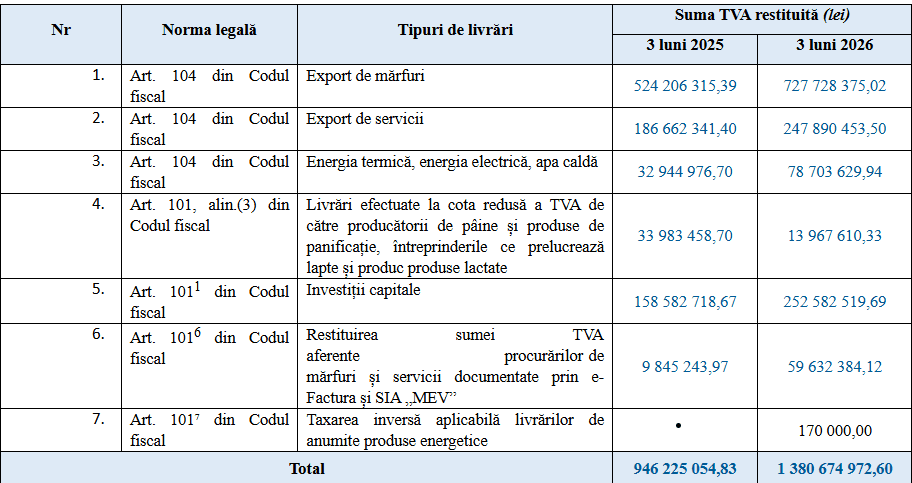 Государственная налоговая служба Республики Молдова сообщила о росте эффективности возврата налога на добавленную стоимость в первом квартале года. В экономику было возвращено около 1,38 млрд леев, что связано с увеличением числа решений и цифровизацией процедур.