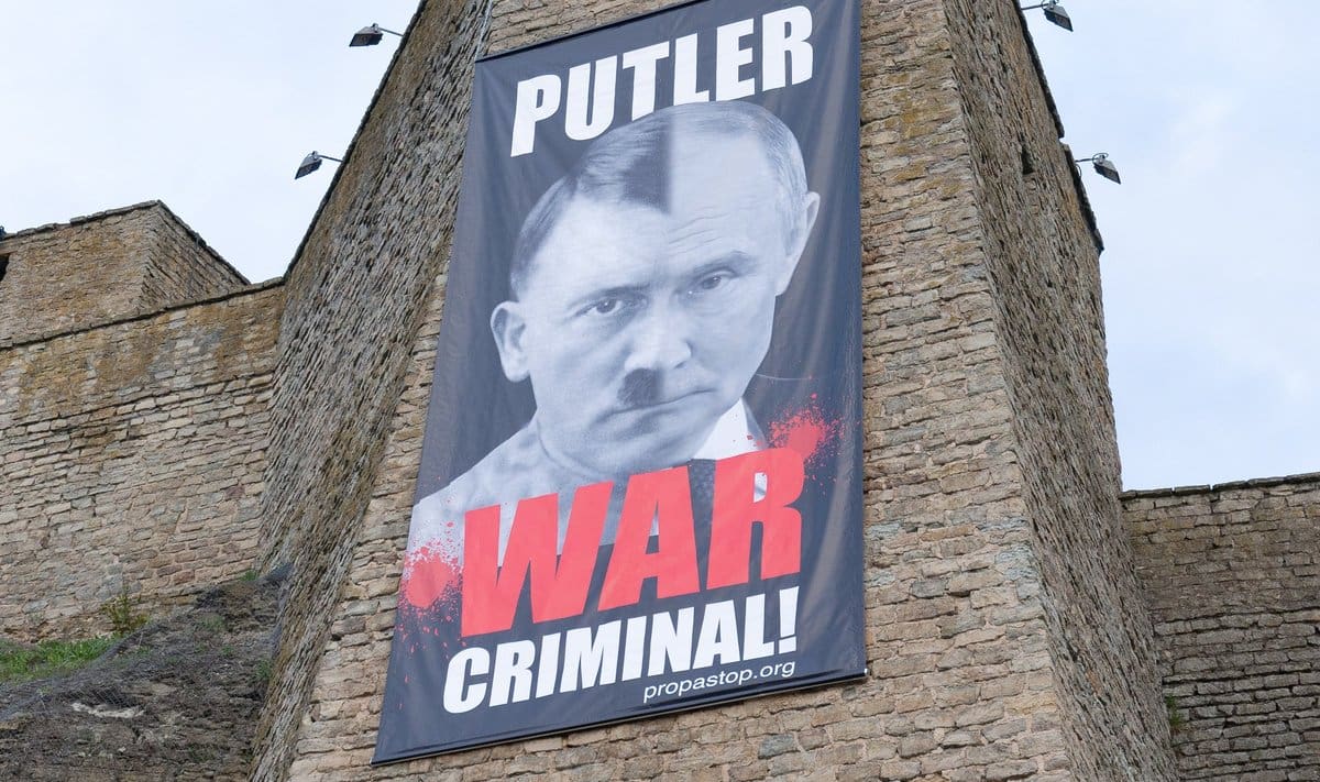 В эстонском городе Нарва на стене средневекового замка, расположенного у границы с Россией, вновь появился баннер с изображением президента РФ Владимира Путина в образе Адольфа Гитлера и надписью «Путлер — военный преступник». Акция приурочена к 9 мая — ежегодно с 2023 года местный музей вывешивает подобный плакат в День Победы.