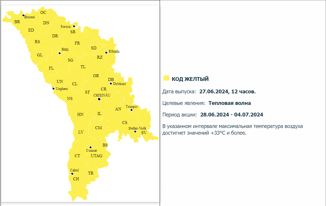 Государственная гидрометеорологическоя служба сообщает о введении «желтого кода» в связи с жарой.