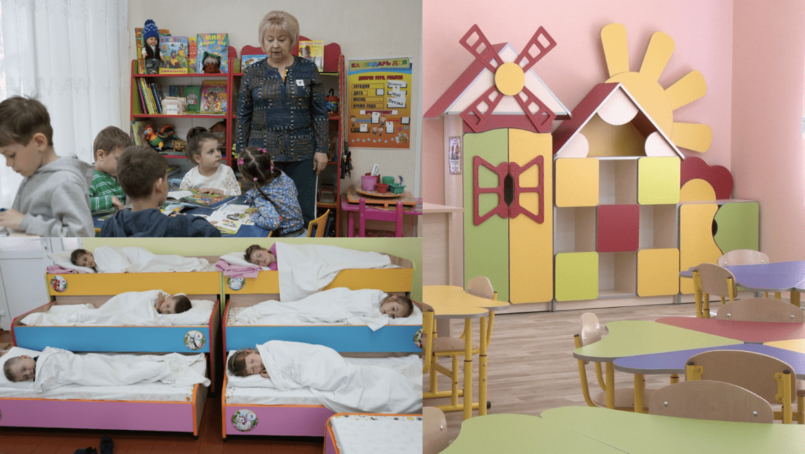 Директор Оксана Мелнич говорит: «Все, что было сделано в этой группе, было сделано благодаря HELVETAS и районному совету. Мы купили шкафы для игрушек, учебные материалы, стол для воспитателей, столы, кухонные шкафы, постельное белье, матрасы и шкафы для одежды».