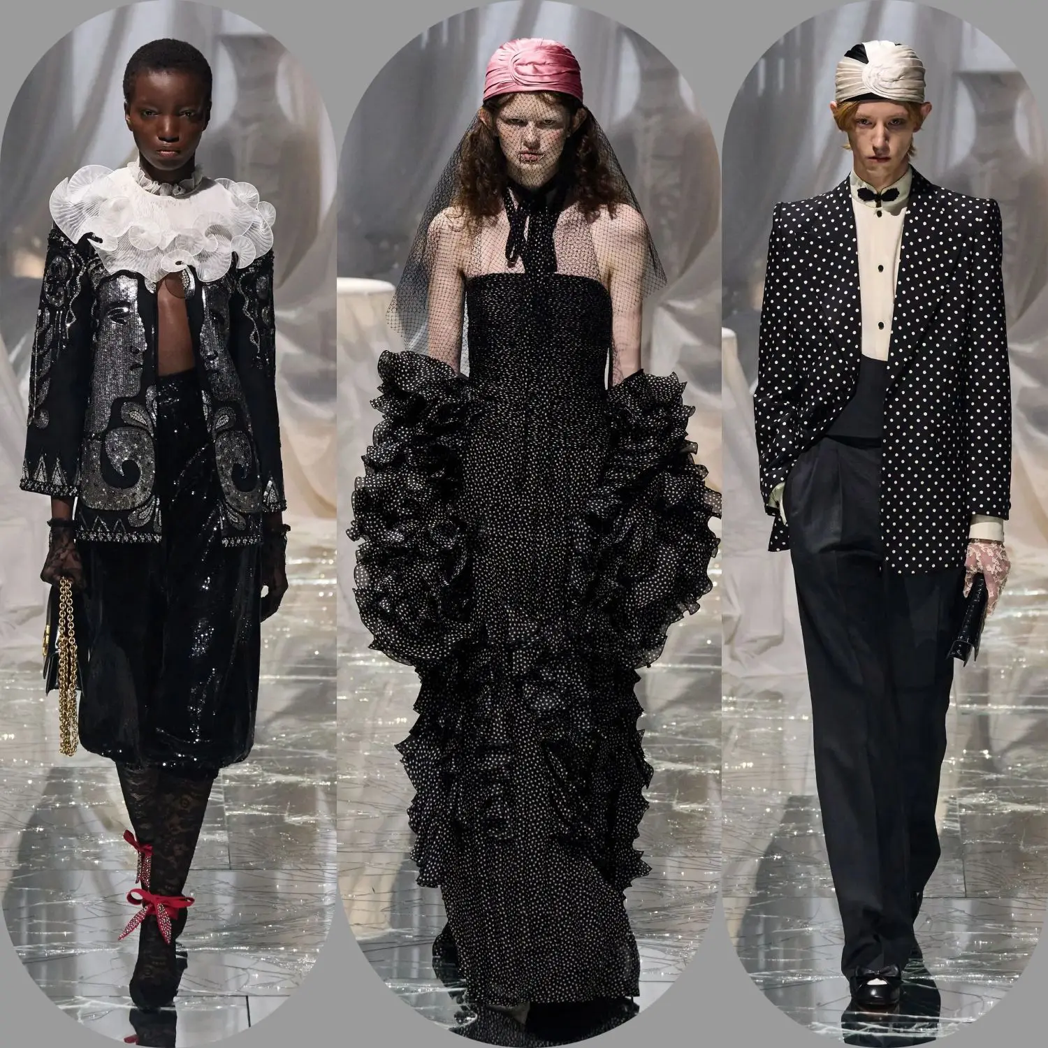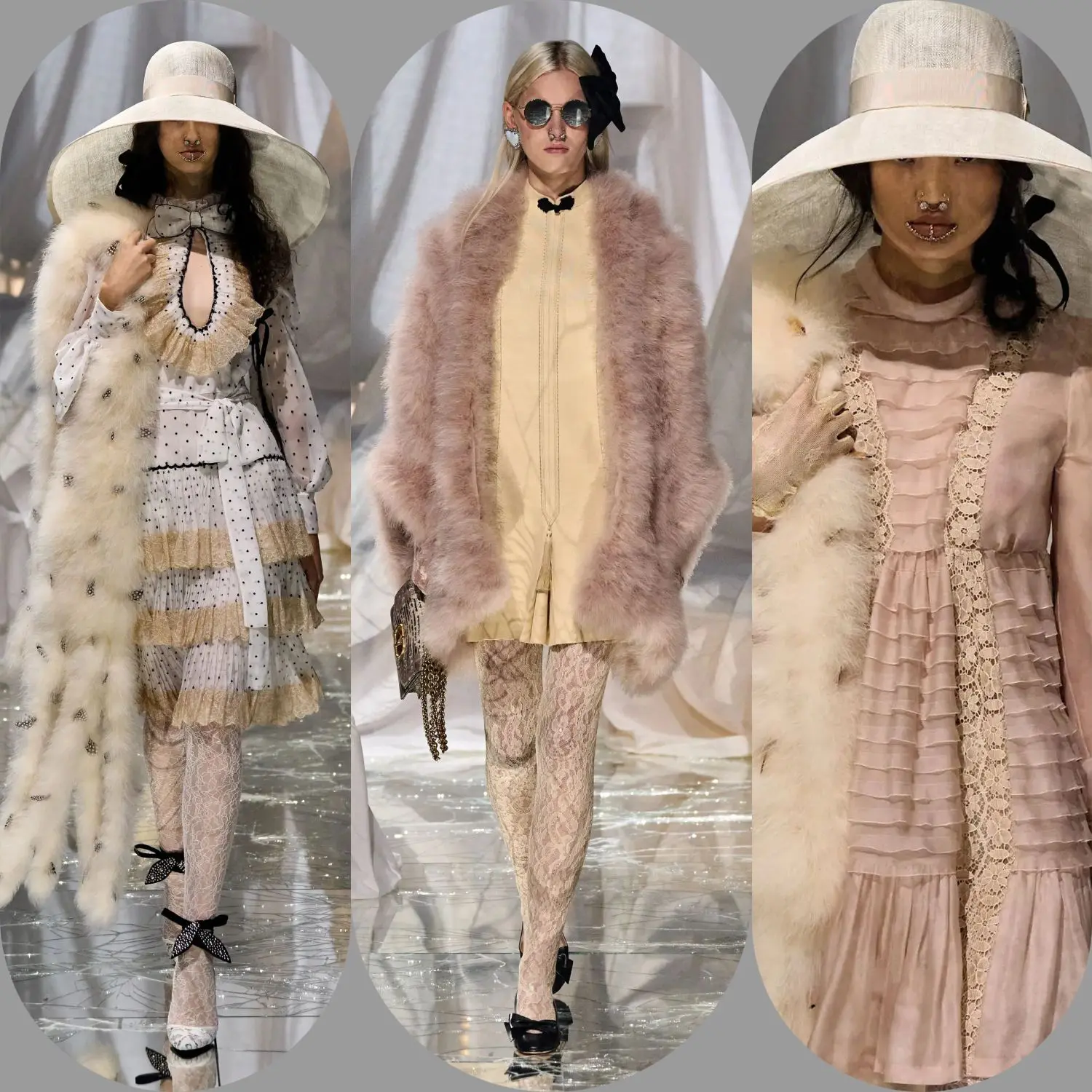 Также важное место в коллекции занял кукольный образ и богемный шик, ведь на моделях можно заметить изделия с жабо, банты и совершенно эклектические сочетания принтов. Ну и нельзя не отметить аксессуары — модельер вводит в моду украшения для лица, тюрбаны и шляпы с перьями.