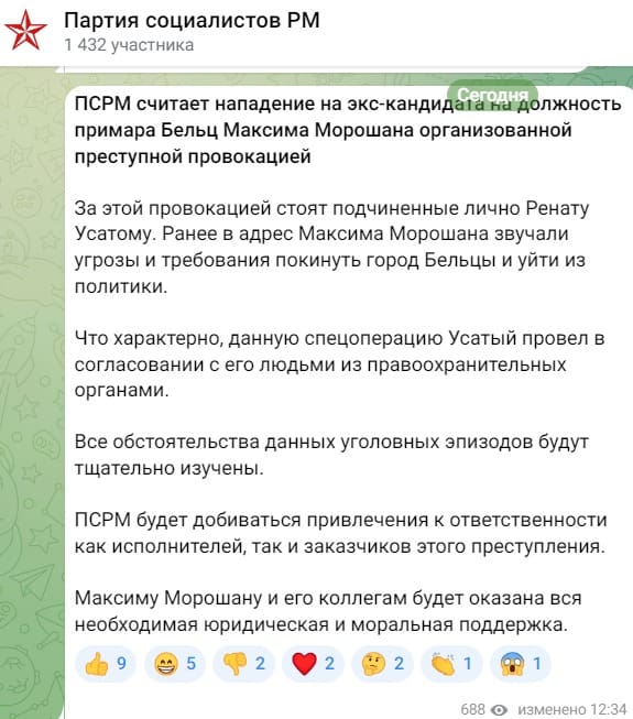 ПСРМ считает нападение на Максима Морошана организованной преступной провокацией: «За этой провокацией стоят подчиненные лично Ренату Усатому. Ранее в адрес Максима Морошана звучали угрозы и требования покинуть город Бельцы и уйти из политики. Что характерно, данную спецоперацию Усатый провел в согласовании с его людьми из правоохранительных органами.