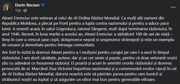 К 79-летию окончания Второй мировой войны премьер-министр Дорин Речан побывал в гостях у ветерана Алексея Еремчука в селе Григорэука Сынджерейкого района.