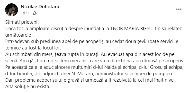 «Уважаемые друзья, подтверждаю: из-за давления воды на крыше прорвало две трубы. Технические службы быстро вмешались и заменили поврежденные трубы, вода со сцены убрана. Однако проблема с крышей остается, ее необходимо решать на самом высоком уровне», — заявил Дохотару.