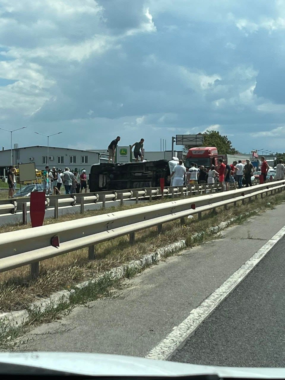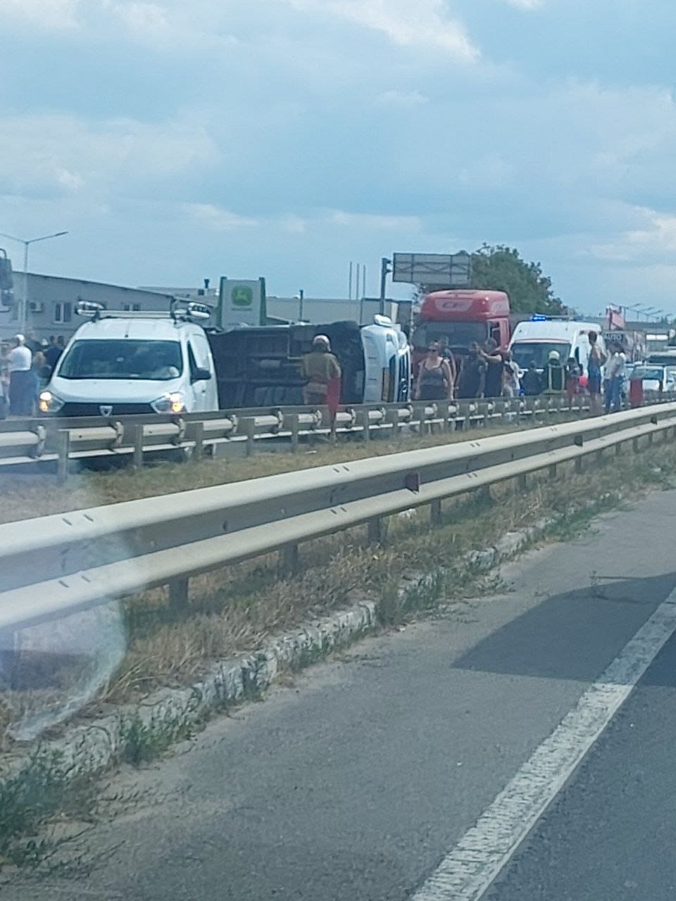 По словам очевидцев, микроавтобус с пассажирами перевернулся прямо посреди дороги. Есть пострадавшие, в районе образовались пробки.
