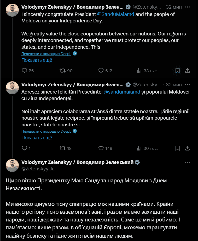 В своем обращении глава украинского государства отметил важность сотрудничества между двумя странами и подчеркнул, что Украина и Молдова тесно взаимосвязаны. По словам Зеленского, совместными усилиями необходимо защищать народы, государства и независимость.