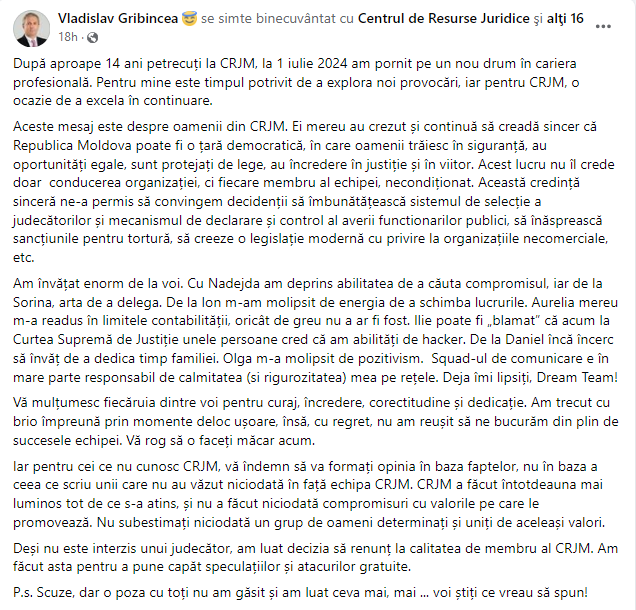 Хотя судье это не запрещено, я принял решение выйти из членства в CRJM. Я сделал это, чтобы положить конец спекуляциям и нападкам», — говорится в сообщении Владислава Грибинчи.