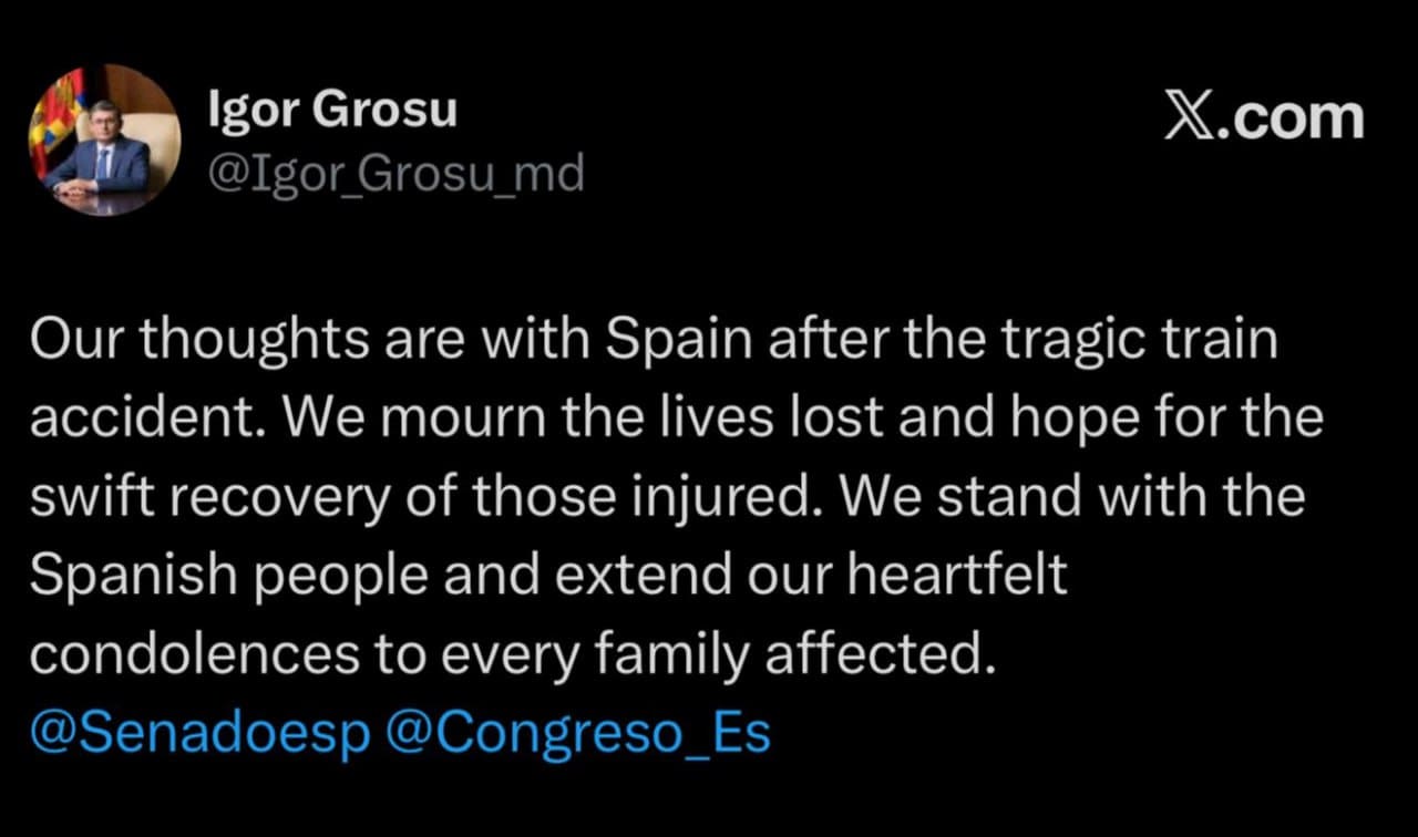 Президент Молдовы Майя Санду и председатель парламента Игорь Гросу направили слова поддержки и скорби семьям погибших и пострадавшим в результате трагического столкновения поездов в Испании.