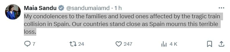 «Соболезнования семьям и близким, пострадавшим в результате трагического железнодорожного столкновения в Испании. Наши страны стоят рядом со Испанией в эти моменты скорби», — написала президент Санду.