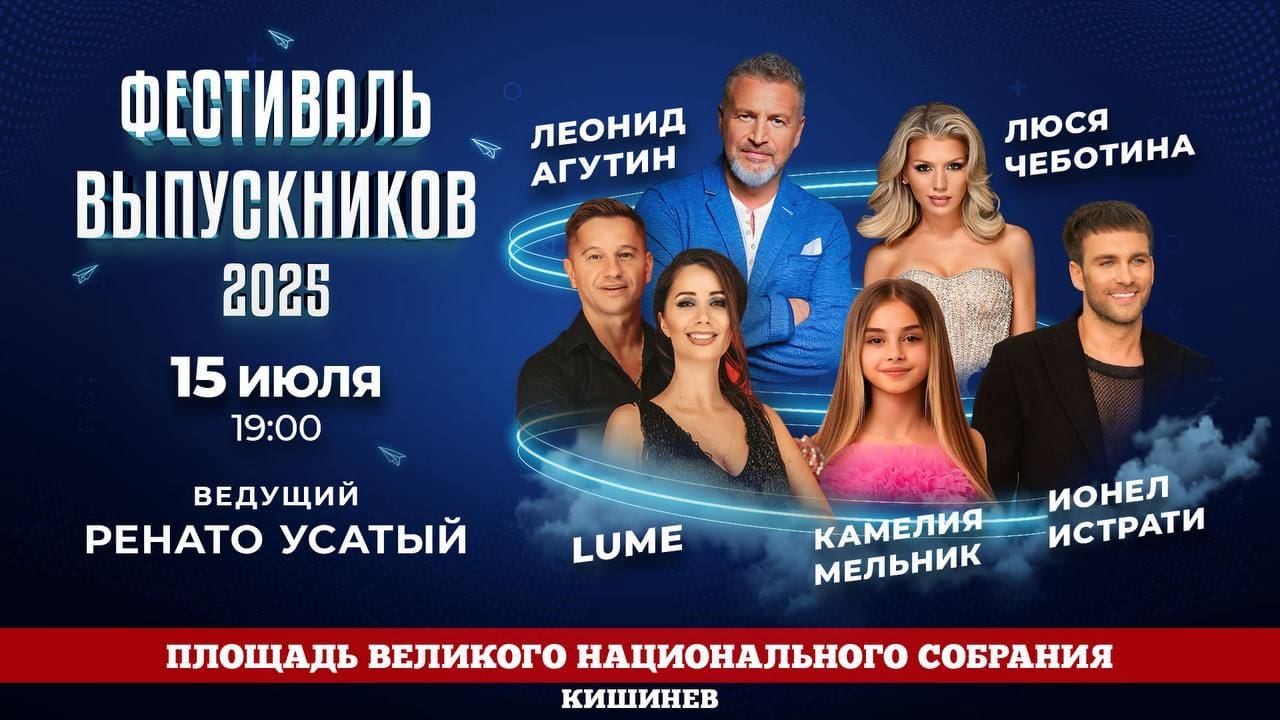 15 июля на площади Великого Национального Собрания состоится второй концерт Фестиваля выпускников 2025 года. В нём примут участие российские звёзды Леонид Агутин, Люся Чеботина, а также группа Lume, Камелия Мельник и Ионел Истрати. Ведущий вечера — Ренато Усатый. Вход свободный!