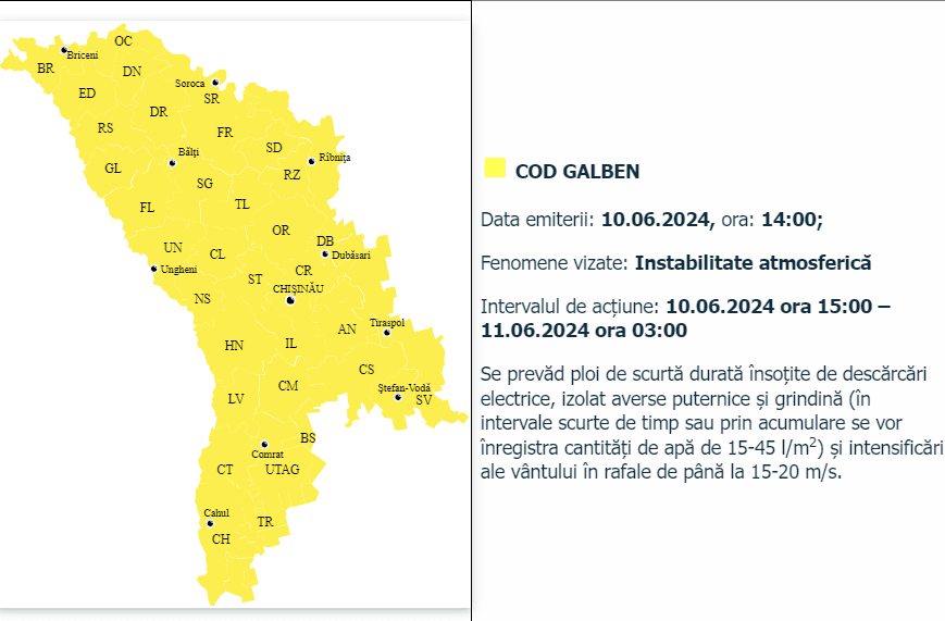 В Молдове ввели второй «желтый код». Предупреждение действует с 15:00 10 июня до 03:00 11 июня.