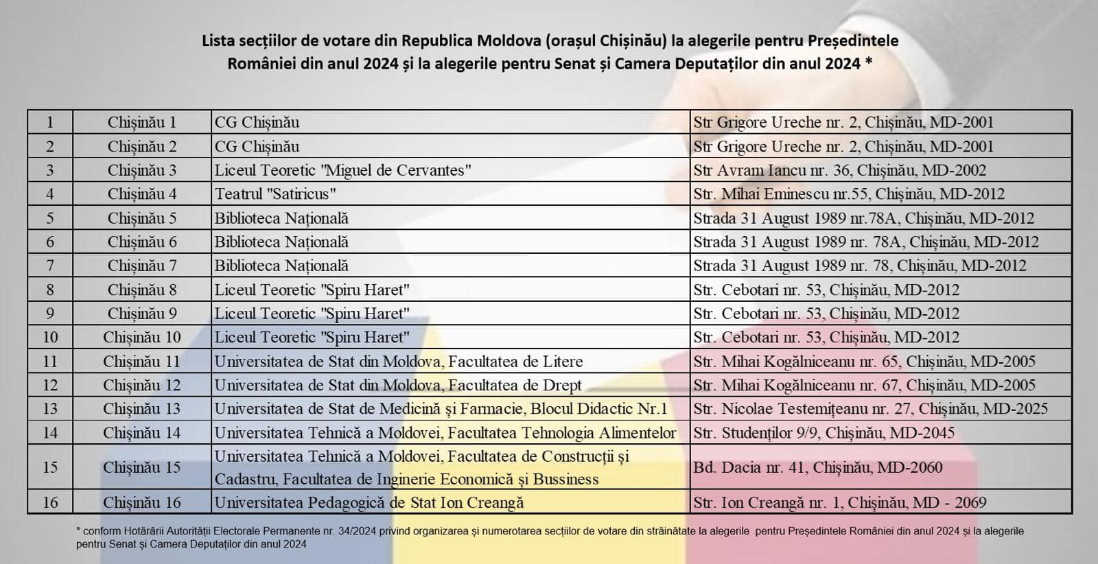 Три участка были перемещены в Национальную библиотеку, еще три – в Теоретический лицей „Спиру Харет”. Также проголосовать можно будет в Государственном университете в здании факультета литературы и права и в Университете медицины и фармацевтики „Николае Тестемицану”.