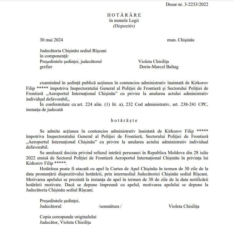 Решение может быть обжаловано в Апелляционной палате Кишинева в течение 30 дней со дня вынесения.