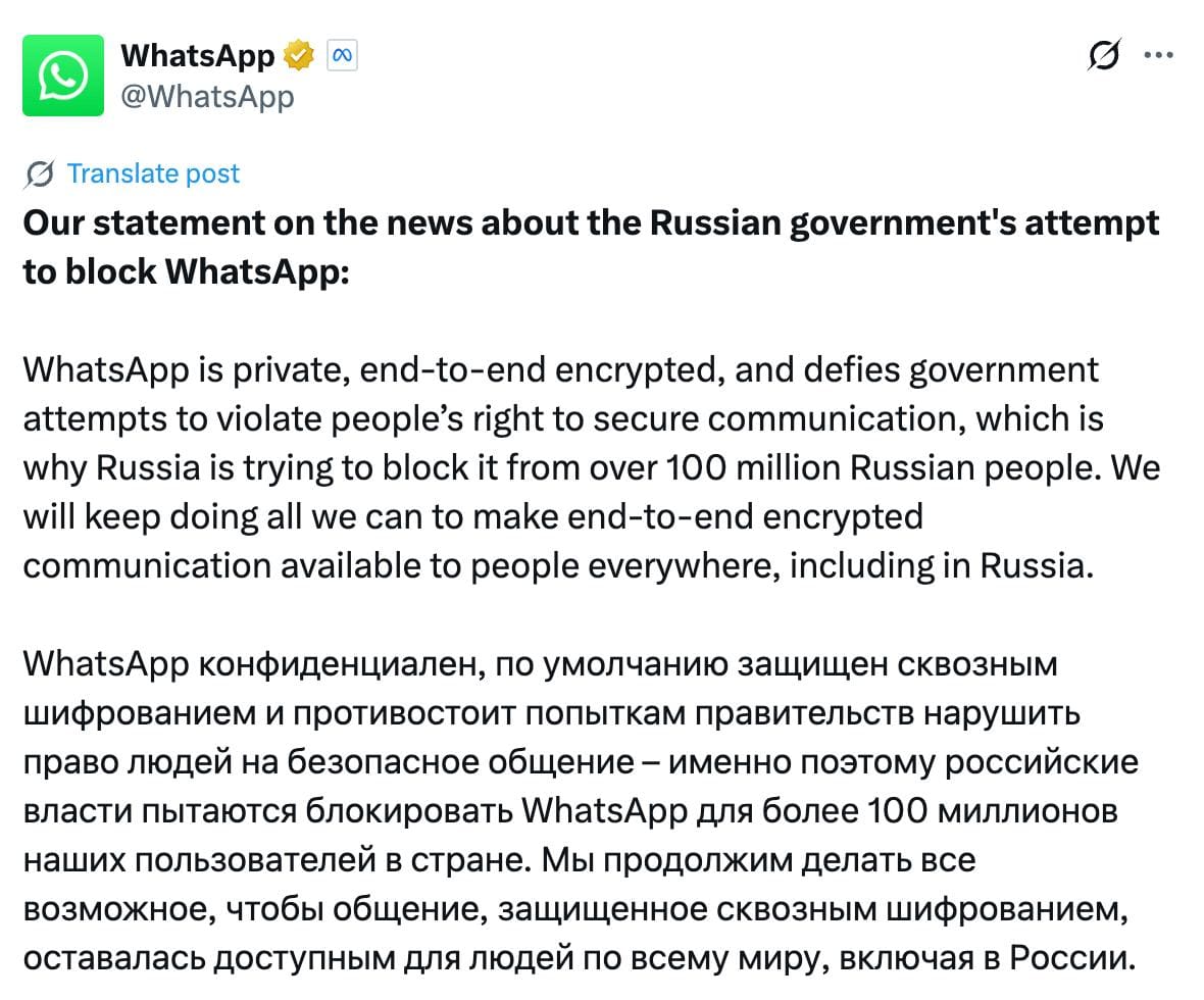 Руководство мессенджера WhatsApp заявило, что российские власти пытаются блокировать сервис для более чем 100 миллионов пользователей в стране, что, по мнению компании, нарушает право людей на конфиденциальное общение. Заявление опубликовано в X (Twitter) на русском и английском языках.